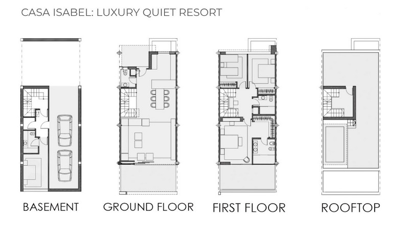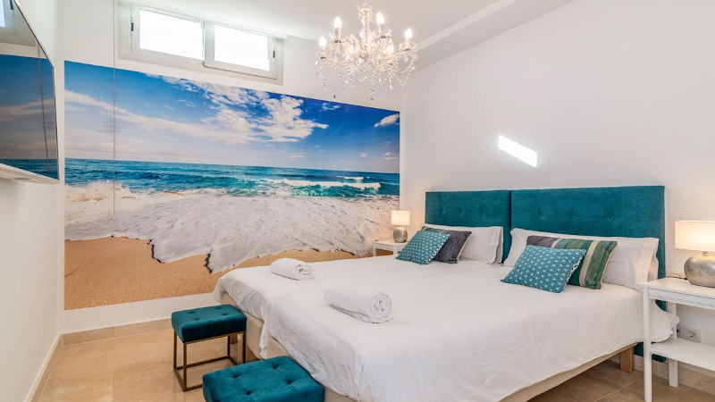 Bottenvåningen bjuder på ett toppmodernt och öppet kök, ett tjusigt vardagsrum med matbord, soffa, fåtölj och tv. Vardagsrummet leder ut till en terrass och liten trädgård där ni har ett middagsbord i det fria. Våning ett har tre sovrum och två badrum samt en terrass med havsutsikt. På takvåningen kommer ni spendera mycket tid. Här finns den privata poolen, loungemöbler, en grill och matbord för middagar i den ljumna Medelhavskvällen. Det fjärde sovrummet är beläget i det svalare källarplanet. Ett snyggt och modernt sovrum med två enkelsängar, tv och intilliggande badrum med dusch.